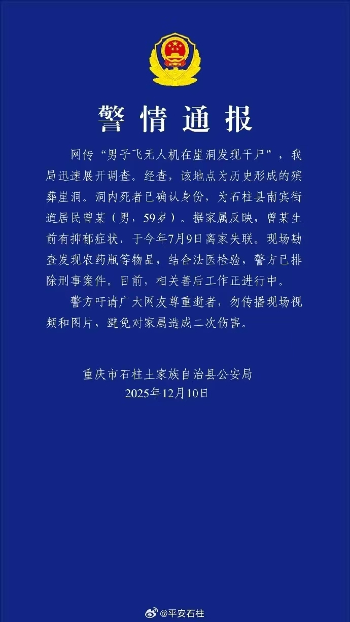 网传 “男人飞无东谈主机在崖洞发现干尸”,我局马上伸开打听。经查,该所在为历史形成的殡葬崖洞。洞内死者已阐明身份,为石柱县南宾街谈住户曾某(男,59 岁)。据家属响应,曾某生前有抑郁症状,于本年7月9日离家失联。现场勘查发现农药瓶等物品,谀媚法熟习,警方已排斥刑事案件。现在,关系善后责任正进行中。警方吁请弘远网友尊重死人,勿传播现场视频和图片,幸免对家属变成二次伤害。
